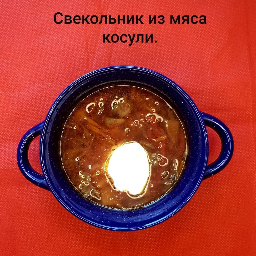 Первый раз приобрела мясо косули. Оно достаточно жирное, вкусное, варится как говядина. Заправку для свекольника приготовила сама ещё осенью во время заготовки. Рецепт напишу позднее. Поэтому приготовление свекольника было не трудоёмким, заняло мало времени. Сварила небольшую полуторалитровую кастрюлю. Свекольник получился наваристым, вкусным, красивым, ароматным. При желании можно добавить в суп свежую морковь и лук. Я не добавляла, так как в заправке всё это есть. Готовьте с удовольствием! Ингредиенты: Мяса косули на кости, Картофеля (1 шт.), Заправки, Лаврового листа, Соль , Перец чёрный молотый , Петрушка , Базилик сушёный , Приправа для мяса , Приправа Марракеш Способ приготовления: Промыть мясо, отварить с лавровым листом, в конце варки посолить по вкусу. Вынуть из кастрюли, остудить, снять мясо с кости, нарезать и вернуть мясо в суп. Кость удалить. Очистить картофель, нарезать. Я для разных супов режу картофель по-разному. Для данного супа нарезала небольшим кубиком. Опускаем ка