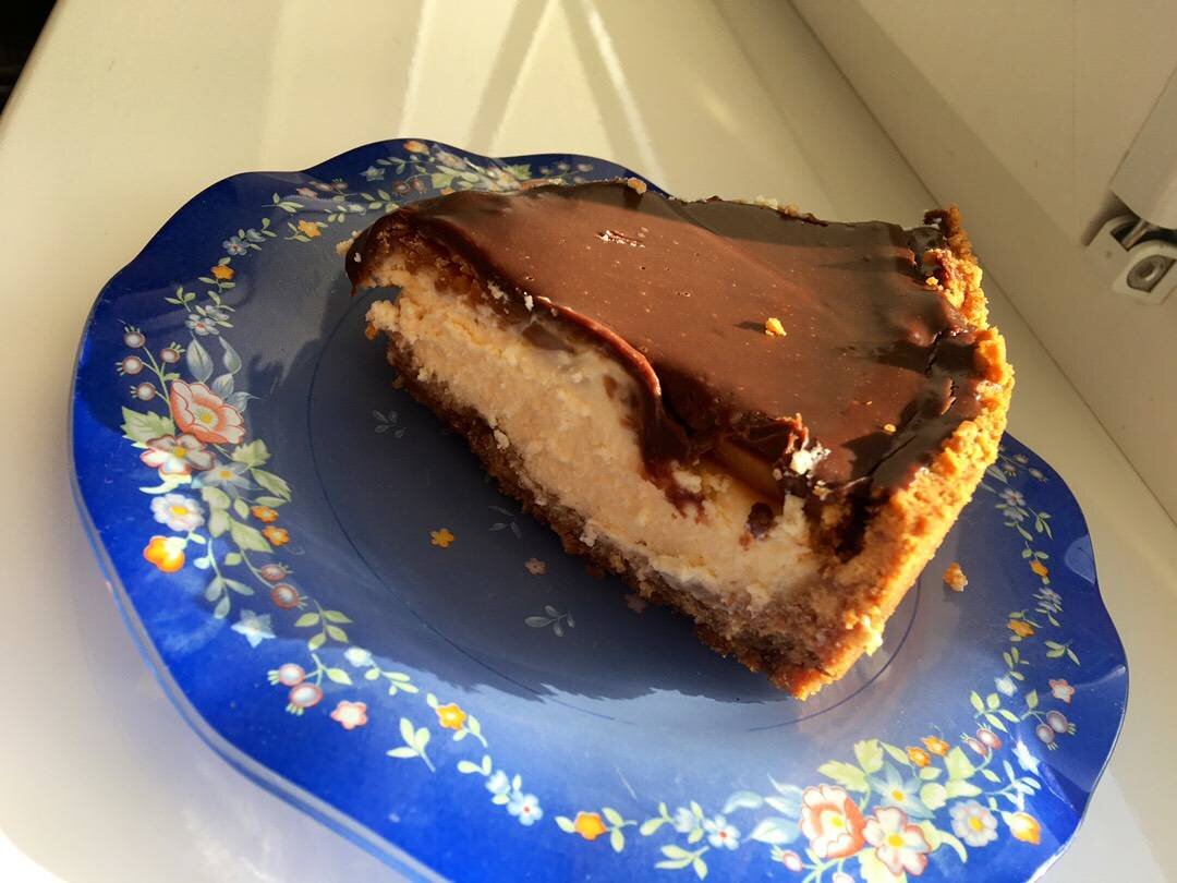 Ингредиенты: печенье песочное, сливочное масло, Начинка, творожный сыр, сахар, сливки 33%, яйца, Карамель, сахар, сливочное масло, соль, горячие сливки 33%, шоколад молочный Способ приготовления: Измельчаем печенье и смешиваем с мягким сливочным маслом. Выкладывает печенье в форму (22,5) и притаптываем создавая дно. В холодильник на 20 минут. Делаем крем. Смешиваем творожный сыр, сливки, сахар и 2 яйца. Хорошенько взбиваем. Заливаем в нашу форму крем и ставим в духовку на 1.5 часа (130 градусов) Начинаем делать Карамель. Растопить сахар, добавить сливочное масло, все это перемешать. Добавить соль, а после горячие сливки. Мешать 3 минуты. Готово. Ждем пока остынет немного чизкейк и заливаем карамелью, а затем растапливает шоколад и заливаем сверху шоколадом. Ставим на 5 ч. в холодильник. Чизкейк готов! Приятного аппетита. 💘