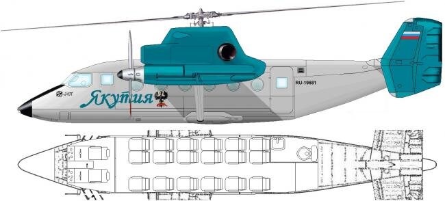 У винтокрыла топливные баки находятся в крыльях, что уже снижает лобовое сопротивление, как и отсутствие хвостового винта. Сегодня винтокрыл с одним несущим винтом на базе вертолета Ми-38 с современными двигателями ТВ7-117 будет иметь крейсерскую скорость не менее 360км/ч. при той же грузоподъемности (более подробно в прошлой статье).