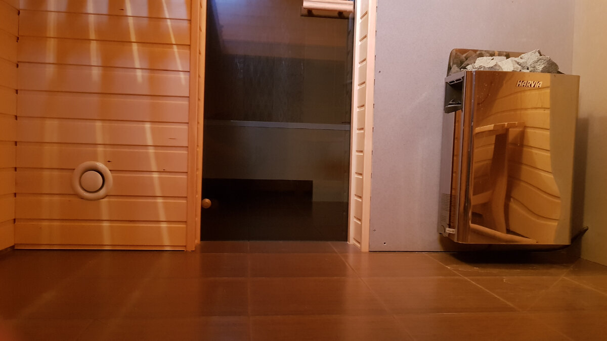 Вытяжка, конечно, важный элемент сауны. Во время строительства дома, ещё при проектировании, в сауне был предусмотрен вытяжной канал, выходящий, как и в других помещениях примерно в 20 сантиметрах от потолка. Однако, начитавшись теории про бани и сауны, я понял, что вытяжку надо переносить и организовать её выход буквально в 10 сантиметрах от пола. Объясняется это довольно просто. Если оставить вытяжку наверху, то горячий воздух, который мы создаем с большими усилиями, свободно вытечет наружу. Поэтому там вытяжку делать не надо. Но при этом есть мокрый холодный пар, имеющий большую теплоемкость который норовит отобрать тепло от сауны. Вот этот холодный пар и надо удалять через вытяжное отверстие расположенное как можно ниже. Но это не все. Вентиляционная труба выходит на крышу и за счет её высоты создается тяга которая и вытягивает влажный воздух из помещения сауны. Для возмещения воздуха, в сауне должно быть приточное отверстие. Если его делать из соседнего помещения, скажем комнаты о