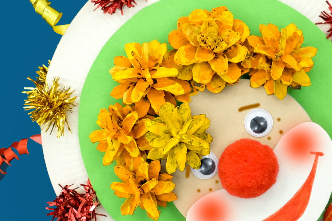 Не секрет, что все дети любят пошуметь и их радуют звучащие игрушки. Сегодня сделаем весёлую шумелку для детского праздника. Объёмную аппликацию с клоуном также можно использовать для украшения открытки. Шумелка своими руками Для работы нам понадобятся: Первое, что мы сделаем это возьмём сосновые шишки и покрасим их в какой-нибудь яркий цвет. Мой клоун будет рыжим. Пока шишки сохнуть задекорируем тарелки и сделаем шумелку. Смотрите 4 фотографии. Нанесём клей по окружности первой тарелки и закроем второй. Встряхнём, чтобы убедиться, что крупа не выпадает. Для изготовления объёмного лица возьмём металлическую крышку. Из картона телесного цвета вырежем круг такого же размера как крышка. И приклеим его к ней. Внутрь крышки насыпаем крупу, но это необязательный шаг. Заклеиваем крышку с обратной стороны ещё одним кругом. Это будет дополнительная шумелка. Вырезаем белую часть лица. Рисуем рот красным фломастером. Вырезаем круг из зелёной бумаги и крепим на клей к шумелке. Клеим лицо. Из пушис