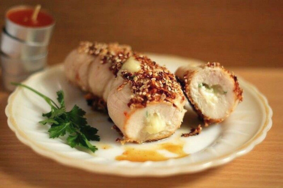 🟡Ингредиенты: ▫️1 куриное филе; ▫️30 гр. сулугуни; ▫️2 зубчика чеснока; ▫️1 веточка петрушки; ▫️1 ч.л. сладкой паприки; ▫️1 ч.л. кунжута; ▫️Соль, свежемолотый черный перец. Приготовление: ▫️Вдоль филе сделать неглубокий надрез, также сделать неглубокие надрезы вправо и влево, не прорезая филе насквозь. Филе раскрыть, положить между двумя слоями пищевой пленки и аккуратно отбить. Петрушку мелко покрошить. Чеснок натереть, половину чеснока смешать с кунжутом и пряностями. Сыр также натереть на терке и смешать с оставшимся чесноком, добавить петрушку. ▫️На куриное филе выкладываем сырную смесь, аккуратно заворачиваем и завязываем полученный рулет шпагатом. ▫️Смазать рулет специями. Духовку разогреть до 200 °C и запекать 15-20 минут.