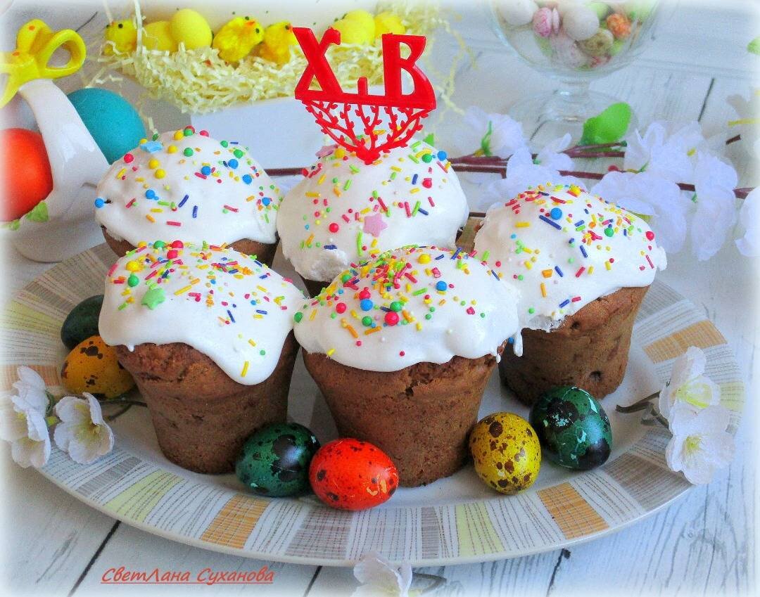 #пасха Эти куличики-кексы пеку уже много лет, даже уже не представляю свой пасхальный стол без них! Очень удобно их раздавать, нравятся всем и детям, и взрослым. Ингредиенты: яйца, сахарного песка, творога (у меня был 9 процентный), сливочного масла или маргарина, картофельного крахмала, муки, соды или 1 ч. ложкаразрыхлителя, изюма, орехов Способ приготовления: Яйца растереть с сахаром, *добавить творог, продолжая вымешивать, *всыпать картофельный крахмал, перемешать, *добавить растопленное сливочное масло или маргарин, продолжая мешать, *добавить соду и муку, перемешать, всыпать изюм и измельчённые орехи, *все перемешать и выложить в маленькие, смазанные растительным маслом формы (на ~ 1/2-1/3 от объёма), *выпекать ~ 30 минут при температуре 160-180 °С.
