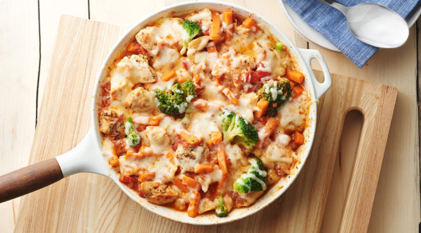Метод приготовления: В сковороде с антипригарным покрытием нагрейте оливковое масло на среднем огне. Добавьте курицу, лук, соль, итальянскую приправу и перец. Готовьте от 4 до 5 минут, время от времени переворачивая, пока курица не перестанет быть розовой в центре и не подрумянится. Уменьшите огонь до среднего. Вмешайте помидоры и замороженные овощи. Накройте крышкой и готовьте 15-20 минут или пока овощи не станут мягкими и не прогреются. Посыпать сыром. Накройте крышкой и готовьте 1-2 минуты или пока сыр не расплавится.