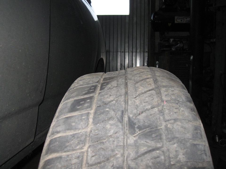 Ходовка имела кое-какие неисправности, но руль трясло на ходу явно из за вот этого колеса, которое стояло на передней оси: Полный размер Кто не понял, там грыжак (шишка на покрышке) прямо на протекторе. Повело шину, повредились и сместились слои корда и резины. Цилиндрическая форма шины нарушилась и шина приобрела более сложную форму (в народе называют это "восьмёрка" или "квадратные колёса"))). Полный размер Ну а что тот шиномонтажник, который только что занимался этой проблемой? А он был наверное с умным лицом. Снял колесо с тачки не глядя (думая в это время наверное о чём то важном). Потом зажал колесо в патроне станка. Закрыл колесо защитным колпаком (так положено)). И включил умный станок балансировочный. Станок офигел от дисбаланса (норма вообще то до 80 граммов, а