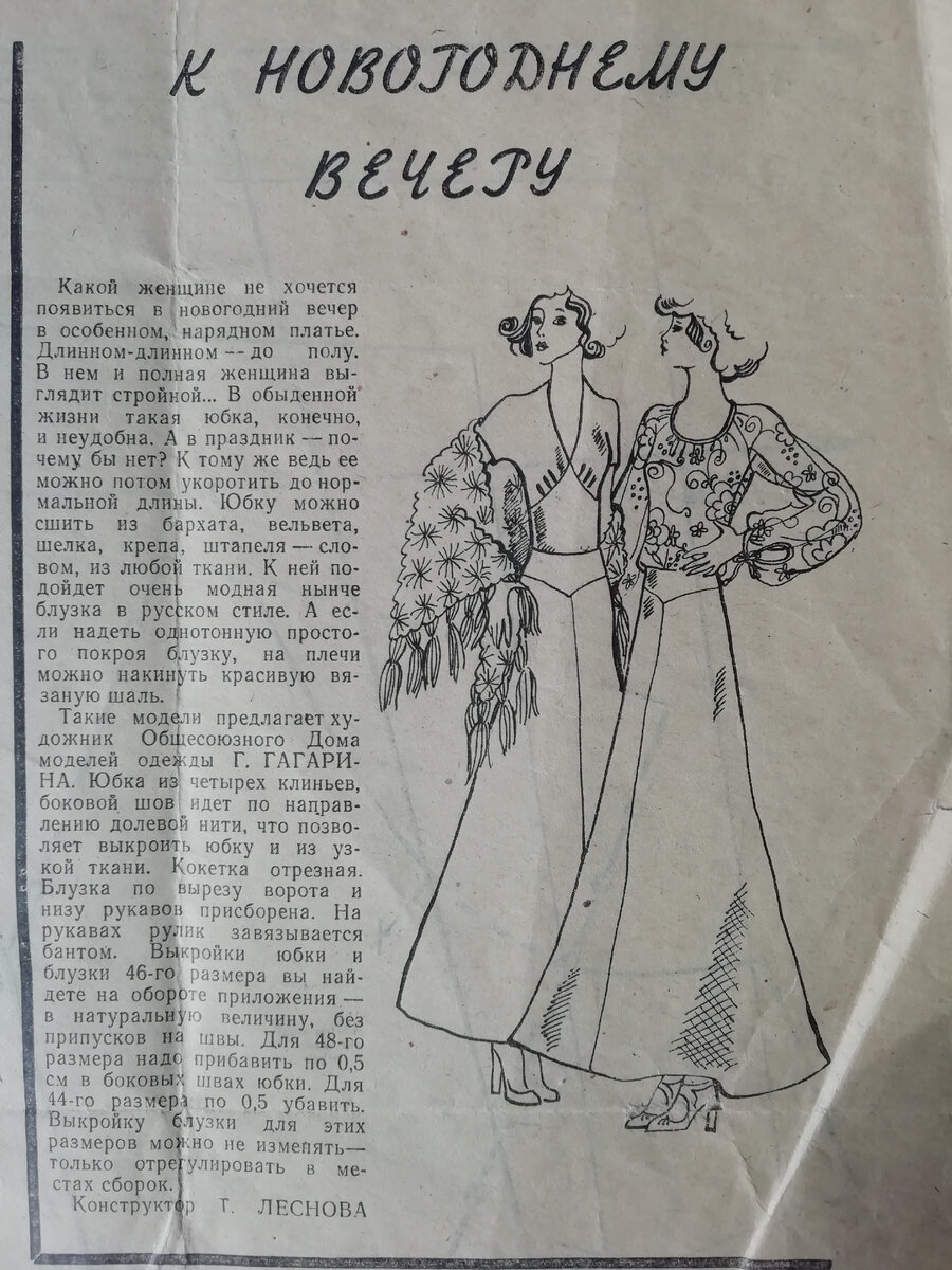 Так выглядит описание наряда к Новому Году в приложении к журналу "Работница" № 11 за 1974 год. Модель блузки на фото справа. Особенности фасонов описаны и компановки комплекта предложена в статье: Какой женщине не хочется появиться в новогодний вечер в особенном, нарядном платье. Длинном-длинном - до полу. В нём и полная женщина выглядит стройной... В обыденной жизни такая юбка, конечно, и неудобна. А в праздник - почему бы и нет? К тому же, ведь её можно потом укоротить до нормальной длины. Юбку можно сшить из бархата, вельвета, шёлка, крепа, штапеля, - словом, из любой ткани. К ней подойдёт очень модная нынче блузка в русском стиле. А если надеть однотонную простого покрой блузку, на плечи можно накинуть красивую вязаную шаль. (О вязании шали в этом же приложении.) Такие модели предлагает художник Общесоюзного Дома моделей одежды Г. ГАГАРИНА. Юбка из четырёх клиньев, боковой шов идёт по направлению долевой нити, что позволяет выкроить юбку и из узкой ткани. Кокетка отрезна