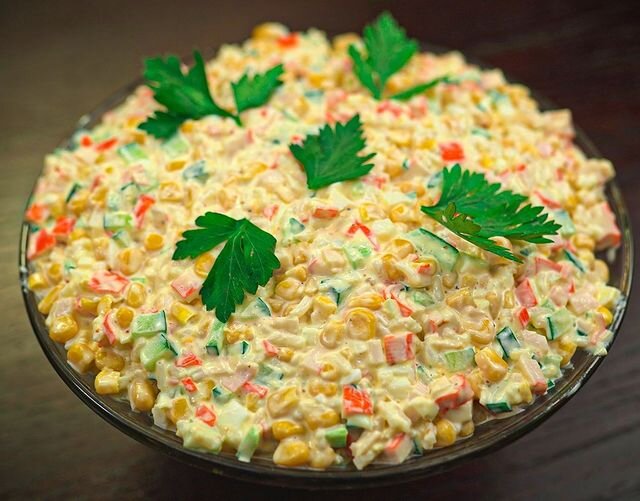 Ингредиенты на миску 2 кг: 500 гр крабовых палочек 400 гр яиц (~4 шт) 2 огурца (~200 гр) 500 гр кукурузы 200 гр риса 400 гр майонеза Зелень для подачи Соль, перец Приготовление Яйца и рис отварите. Чтобы рис получился рассыпчатым варите его 2/3 времени от указанного на пачке, слейте воду и оставьте под крышкой еще на 10 минут. Крабовые палочки и готовые яйца нарежьте на одинаковые кубики. Из огурца выньте середину с семенами и также нарежьте. Смешайте все ингредиенты вместе и приправьте. Перед подачей украсьте зеленью.