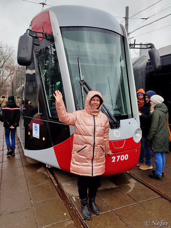 Буквально накануне поздно вечером я увидела анонс: в Москве пройдет парад трамваев. Такое впечатление, что решение о проведении принято спонтанно. И место необычное: депо имени Баумана. Колонна трамваев проследовала до Останкинского пруда и обратно. Затем трамваи припарковались в депо и началось... Их сразу облепили дети. Взрослые тоже не отставали. Народу - тьма тьмущая. Люди, откуда вас СТОЛЬКО? Откуда вы узнали? Почему вам не сидится дома в такую погоду? Сделала фото в стиле обывателей: я и трамвай. Это была единственная возможность сфотографировать его без посторонних людей. Первое, что я увидела, это трамвай, похожий на катафалк. Такой черррный-черррный с тонированными в ноль стеклами, аж дрожь берет. Это R1 - Russia One, разработанный на "Уралтрансмаше" и в ОКБ "Атом". Я видела его на картинках, вот довелось вживую. Трамвай представлен летом 2014 года на выставке "Иннопром", но так и не был запущен в производство. Это просто макет, внутри ничего нет, пусто. Рядом милый французски