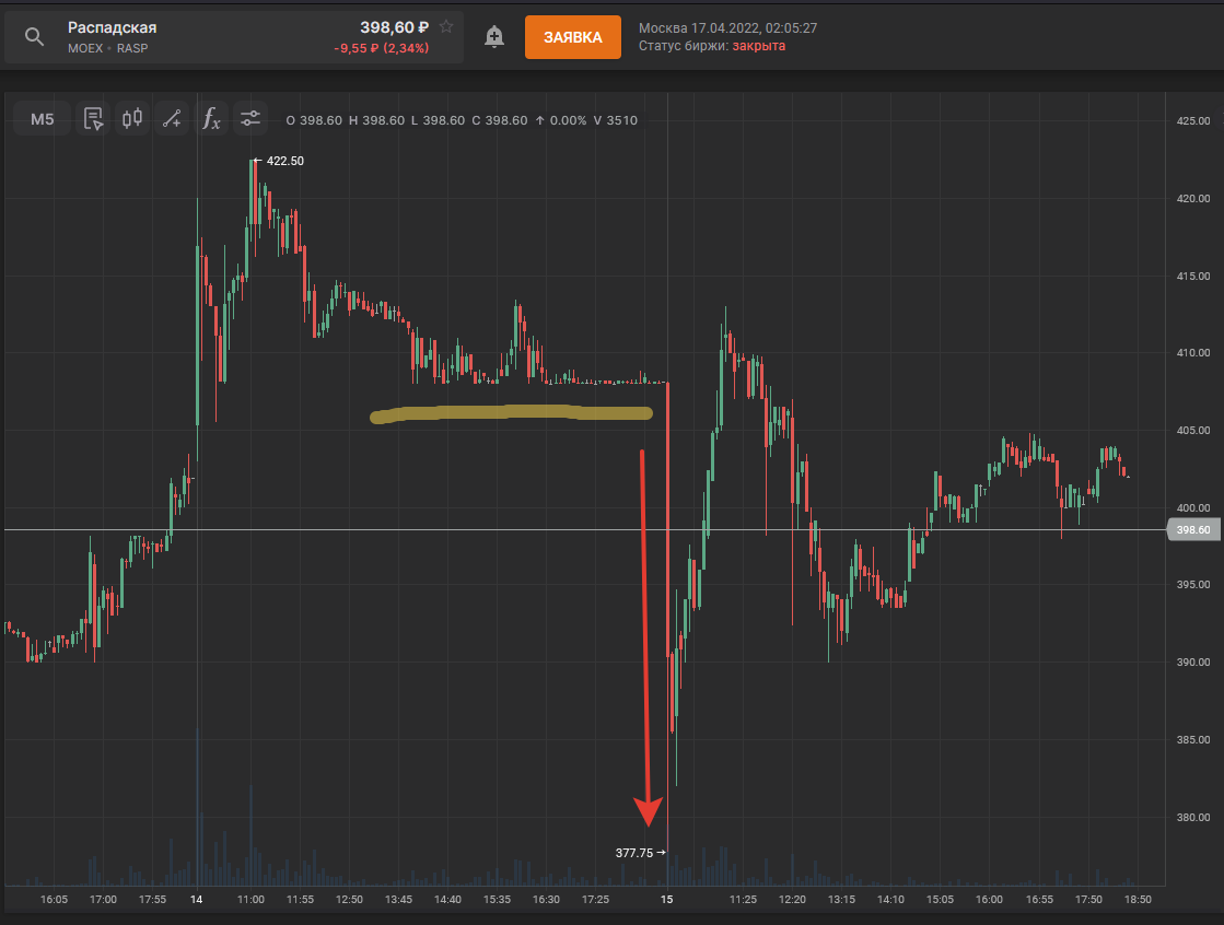 Интересный пример развития событий на слабом рынке. Красиво выглядит, крупный покупатель весь четверг не давал бумажке упасть. И многие попытались воспользоваться ситуацией и тоже покупали, ставя стопы ниже заявки крупняка. Однако в пятницу, крупный покупатель не пришел :) Причины могут быть любые: Проспал, закупился и ему хватило, а может решил развести толпу и закупиться по халявным ценам... Причина не важна, а вот результат предсказуем. Для начала разберем четверг. С утра крупный игрок собрал всех продавцов, пытаясь спровоцировать толпу на дальнейший рост. Однако народ был настроен пессимистично и цену быстро вернули обратно. После чего, наш крупняк вновь предпринял попытку задрать цену и, в этот раз, толпа его поддержала. Однако, кто-то эту толпу остановил и рынок начал валиться. После чего была выставлена огромная заявка на покупку и рынок замер возле её… Какие выводу покупателям в четверг нужно было сделать? Да крупный покупатель держит рынок, однако его никто не под