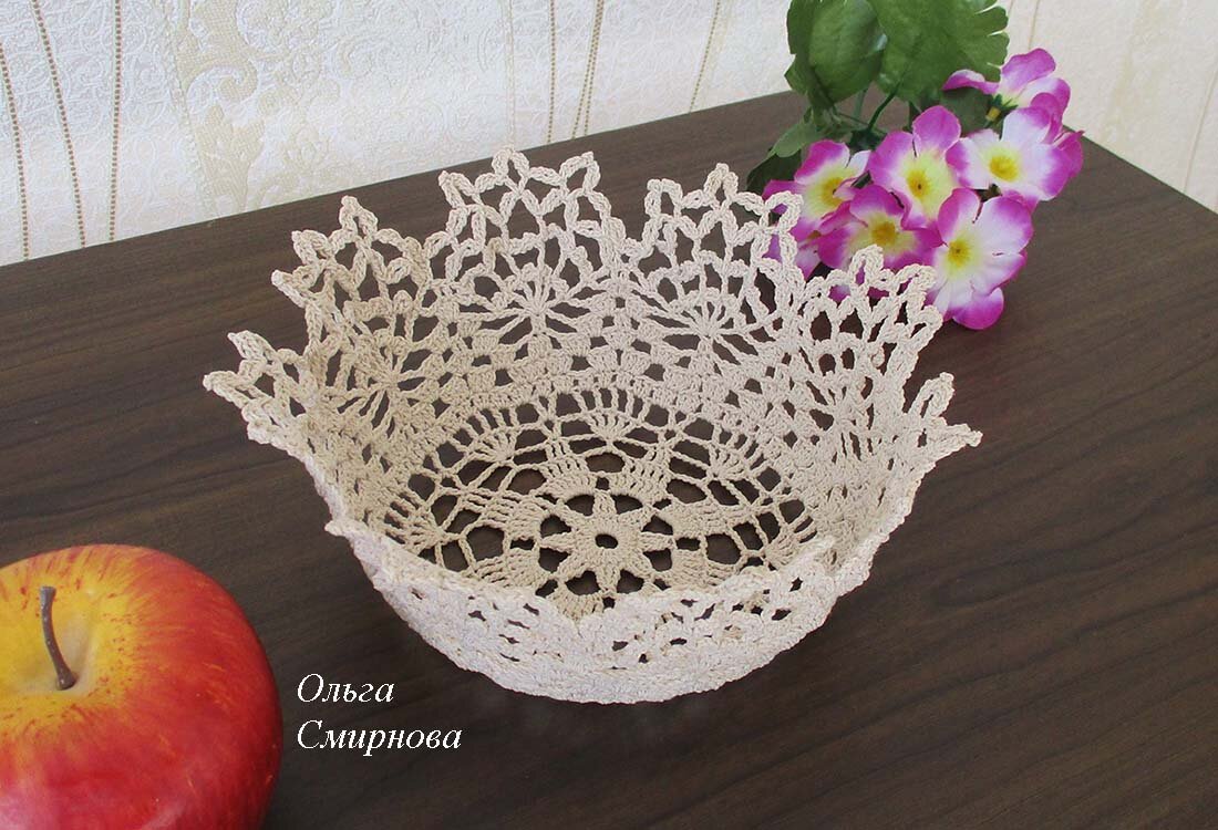 Конечно, декоративную вазочку для конфет можно сделать и из любой маленькой салфетки, но хотелось связать крючком по схеме именно для вазочки. Долго искала такой вариант, чтобы пришелся по душе и вот свершилось! Вазочка получилась ажурная и прелестная. Использовала нитки "Лилия" цвета льна, крючок 1,25. Диаметр донышка - 11 см, по верху - 19 см, высота - 7 см. Схема очень интересная, особенно вязание верхних рядов, где между столбиками идут горизонтальные "листочки". Вообще, вязать легко и просто, а главное быстро. Готовую деталь я намочила в клее ПВА, разбавленном водой, и натянула на вазочку хрустальную. Видео мастер класс тоже есть. Смотрите в ленте моих публикаций.