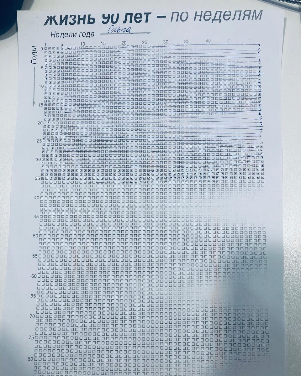 Это очень полезный пост ( впрочем, как и многие😊), но именно после него, вы начнёте по другому относиться к своей жизни. ⠀ Я хочу рассказать об уникальном календаре, который разбит на недели, на одном листе бумаге, расписана наша жизнь до 90 лет ( оптимистично очень). ⠀ Каждая клеточка - это одна неделя, а горизонтальный ряд - один год. ⠀ Это время, которое нам дано для жизни! ⠀ Теперь необходимо закрасить уже прожитые недели... знаете, немного даже в дрожь бросило. ⠀ Сразу начинаешь переоценивать всю свою жизнь, вспоминать мечты и цели💫 ⠀ Наглядно видишь, как время относительно. Вроде тебе 35 лет, и кажется ещё вся жизнь впереди, но глядя на календарь, понимаешь, как все в этом мире относительно, особенно время. ⠀ Понимаешь, что неделя, это довольно большой промежуток времени, и нужно приложить все силы, чтобы неделя была прожита не напрасно. Стараешься сделать неделю максимально продуктивной, счастливой и насыщенной. Ведь, до конца листочка не так много клеточек... ⠀ Мотивирует ли