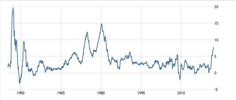 Смотрите график исторической инфляции в США. На нем видно, как в 1965 году начался рост инфляции. Кстати, сейчас мы находимся фактически на тех же уровнях! В 1973 году как раз был промежуточный пик инфляции, после чего она продолжила свой рост.