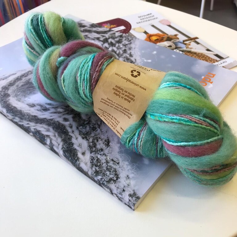 Эта пряжа идеальна для зимних шапок, снудов и варежек. Рекомендуемые спицы №6,5, крючок №8.