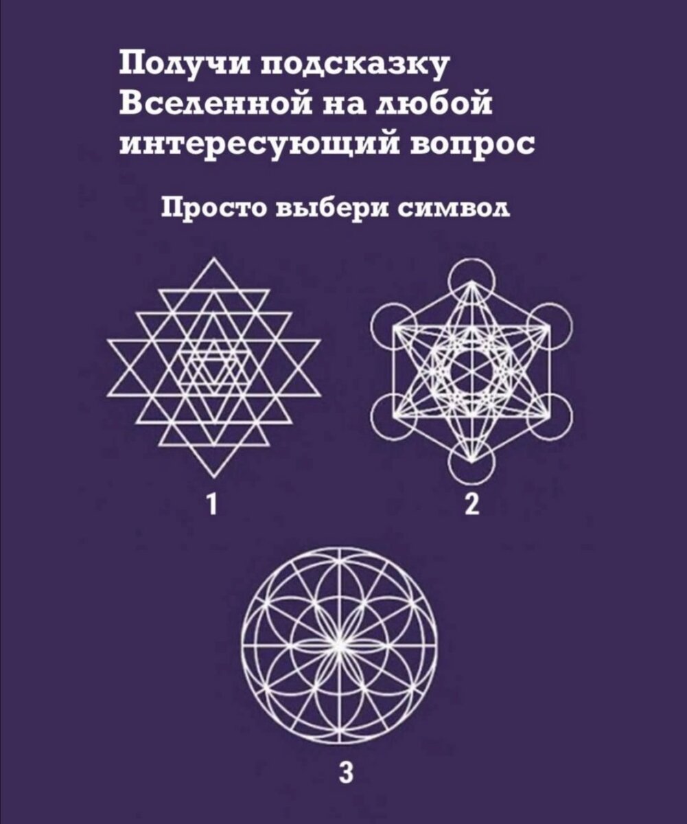 Когда ты в тупике или на распутье, часто нужен совет, намек из вне, психология мышления нам в помощь😊 Посмотри на картинку ниже ⬇️ Не задумываясь выбери символ и получи подсказку от вселенной ✨ Выбрал? А теперь читай совет⬇️ Символ номер 1. Символ номер 2. Символ номер 3. И самое главное, в разное время, в разных ситуациях мы можем выбрать другой символ. Так, что Подпишись и в любой непонятной ситуации возвращайся сюда, к подсказке 🤗