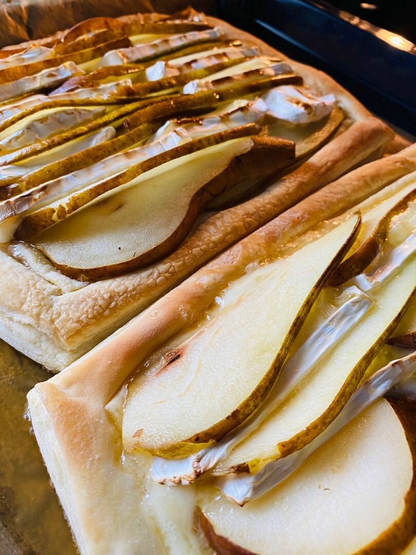 Ингредиенты: дрожжевое слоеное тесто, груши, мёд, сыр бри, сыр камамбер