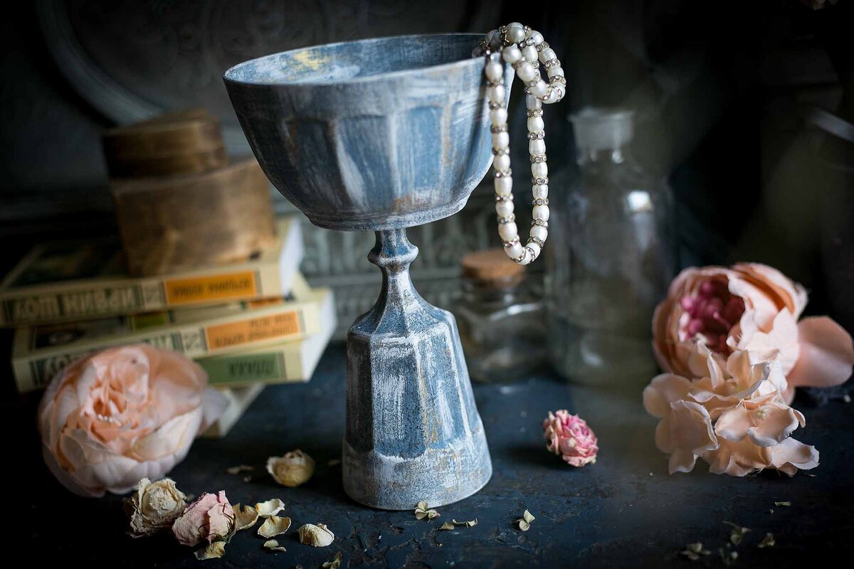 Вазочка или конфетница на высокой ножке у нас всегда стояла на трюмо в прихожей. Какая-то мелочевка хранилась в ней: невидимки, монетки, ключ от почтового ящика… Сделать такую вазочку можно из подручных средств. Я использовала пластиковую миску и стакан из фикспрайса. Прежде всего нужно утяжелить конструкцию, так как пластик очень легкий и вазочка будет все время падать. Для этой цели я развела гипс (алебастр из строительного магазина) и залила его внутрь стакана. Когда разводите гипс, всегда сначала наливайте в емкость воду, а потом всыпайте гипс. Гипса нужно столько, чтобы он перестал тонуть и оставался горкой над водой. Перемешиваем его ложкой (сильно долго не мешайте, работать с гипсом надо быстро) и выливаем в стакан. Оставляем до полного высыхания. И миску и стаканчик необходимо ошкурить средней наждачкой чтобы улучшить адгезию с последующими материалами. Склеиваем детали клеем Момент монтаж Жидкие гвозди. Теперь нужно загрунтовать поверхность. Я использую для этого алкидный грун