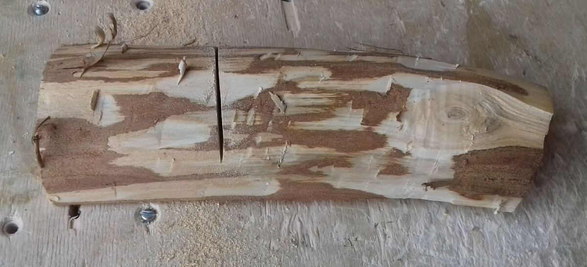 Но я собственно совсем о другом хочу сказать. Так как будет плоскорельефная резьба, то цветовые переходы древесины будут только скрадывать и затруднять восприятие вырезанного узора, поэтому отсюда следует такой вывод: надо резать ложку так, чтобы узор был расположен на гладкоокрашенной части, то есть на заболонной древесине, имеющей светло-серо-бежеватый цвет. Поэтому, как и в прошлый раз, при вырезании ложки буду ориентировать её лицевую сторону обращённой к внешней стороне полена.