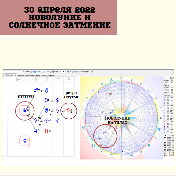 30 апреля 2022 года в 23.30 по мск. произойдёт Новолуние на Лунных узлах. Следовательно, начинается коридор затмений. Солнечное затмение произойдёт 30 апреля в 11 градусах Тельца, а Лунное затмение произойдет 16 мая в Скорпионе. Особенно сильно могут почувствовать на себе влияние затмения те, у кого в космограмме есть планеты в фиксированных знаках: Телец, Скорпион, Лев, Водолей. За неделю, иногда и за две недели до Солнечного затмения начинают закладываться основные события. Поэтому можно в этот период самим заложить что-то позитивное и существенное в своей жизни. Возможно, что в Вашей жизни произойдёт обычное, рядовое на Ваш взгляд событие, но окажется, что Вы будете втянуты в него на долгие годы. Мелкие дела, могут иметь далеко идущие цели. Так как Солнечное затмение произойдёт в Тельце, то поднимутся темы финансов, отношений, комфорта, благополучия. Наблюдайте, что происходило у Вас за две недели ДО и, что будет происходить ПОСЛЕ затмения. На Лунное затмение, которое произойд
