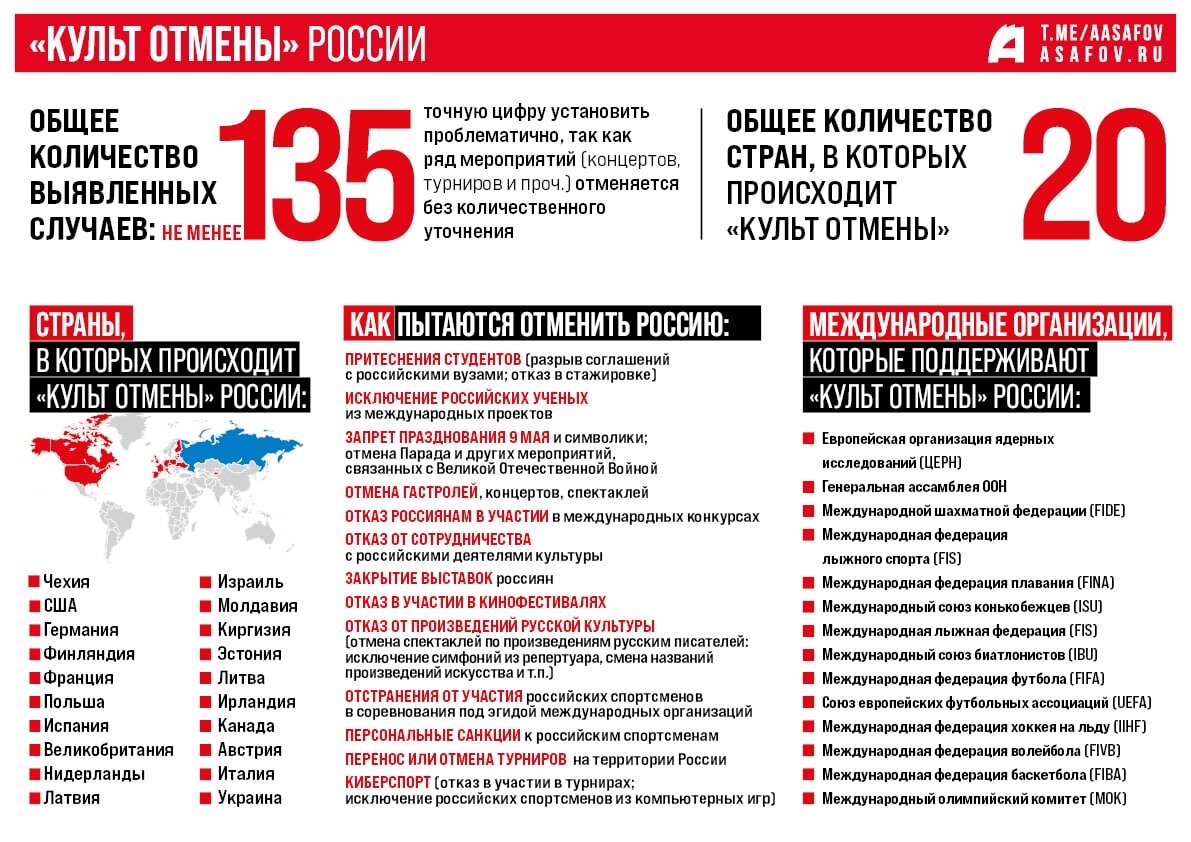 После начала военной спецоперации ВС РФ на украинских территориях Запад объявил России не только экономическую и информационную войну, но и гуманитарную, а основным оружием стала так называемая «культура отмены». Это социальное явление, которое известно еще с античных времен, и сегодня эта «технология» используется США и их сателлитами. Она не имеет никакого отношения к культуре и преследует своей целью возгревание ненависти. Под маской «культуры» прячутся тоталитаризм и идеологическая диктатура, принимающие форму информационной инквизиции, объектом которой стала Россия. Поскольку сама технология, ее применение и поведение ее адептов схожи по своей природе с методами и практиками деструктивных культов, более корректно говорить о «культе отмены». Анализируя информационную повестку за последние два с небольшим месяца, я выявил не менее 135 случаев «отмены России». Это приблизительная цифра, поскольку точное число установить проблематично, так как ряд мероприятий отменяется без