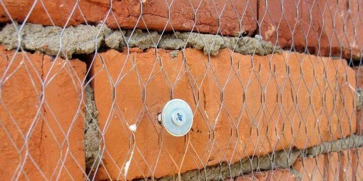Можно также привязывать к шляпкам саморезов сеть посредством вязальной проволоки. Сначала вкручивают саморез (не довинчивая до конца), затем, прикрепив проволоку, заглубляют до упора. Печники исстари закладывали концы вязальной проволоки в кладку, а выводами фиксировали сеть. Так можно поступать и ныне, если стены из кирпича кладёте собственноручно.