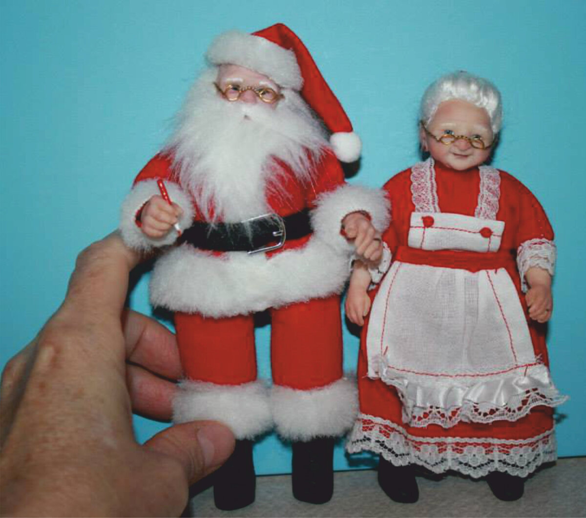 Келли Бекетт До Рождества и Нового года еще много времени скажете Вы и будете правы, но только отчасти... Сейчас самое время заняться творчеством для новогодне-рождественского марафона. Поэтому будем учиться делать Санта Клауса и миссис Клаус. Если захотите сделать Деда Мороза, то выкроите шубу до валенок и шапку немного другой формы. 1. Рост Санты 15.5 см, миссис Клаус 14 см. Масштаб 1:12 OOAK Искусство Куклы с деталями: арматурой, одеждой, обувью, очками и париками ручной работы. 2. Понадобится красная трикотажная ткань примерно 20 х 30 см в зависимости от размера готовой работы. Размер легко высчитать. Измерьте голову, тело будет около 6,5-7 голов в высоту, включая нижнюю часть ног и обувь. 3. Сложите ткань лицевой стороной друг к другу и обрежьте сверху. Убедитесь, что ткань тянется из стороны в сторону, что позволит сделать туловище полным. Положите два квадрата ватина на внешнюю сторону каждой части, не доходя до конца шеи и конечностей, где оставляем отверстия для рук