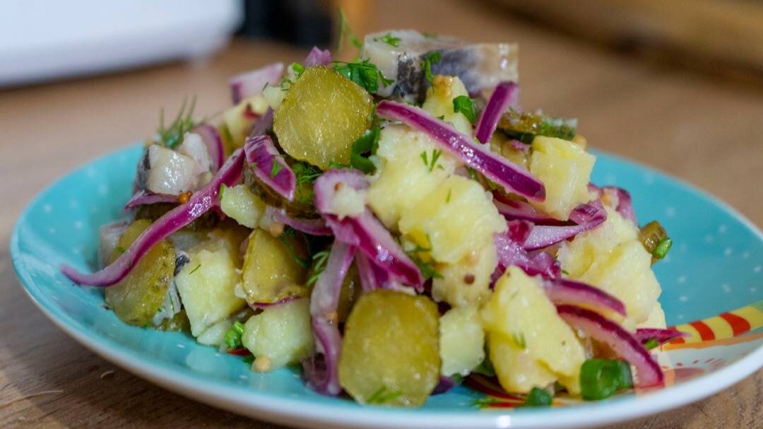 Рецепт приготовления вкуснейшего картофельного салата с селедкой, луком и солеными огурцами. Отлично подходит как для праздничного стола, так и для суровых будней. #салат #картофельныйсалат #салатсселедкой Ингредиенты: Отварной картофель в мундире (крупный) -, Красный репчатый лук , Филе сельди , Соленые огурцы , Зеленый лук , Укроп , Растительное масло , Сок лимона , Горчица зернистая , Уксус 9% , Соль , Сахар , Черный молотый перец Способ приготовления: Картофель отвариваем в мундире, чистим, режем кубиками. Сельдь разберите, удалите все косточки и порубите мякоть на мелкие кубики. Огурцы нарезать круглыми дольками. Лук нарезаем кольцами и маринуем. Для этого залить лук кипятком, добавить сахар, соль, уксус и оставить на 5 минут. Далее воду слить и лук отправить в салатник. Приготовить заправку для салата: Смешать горчицу, лимонный сок, уксус, сахар, соль, черный свежемолотый перец и растительное масло. Отправить нарезанный картофель, сельдь и огурцы в салатник. Заправить салат. Доба