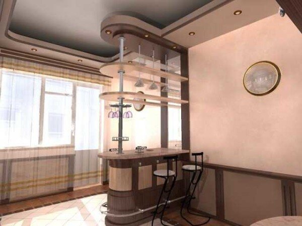 Назначение и виды Если площадь кухни позволяет, барную стойку в кухне ставят по прямому назначению: присесть выпить чашечку кофе или чего-нибудь покрепче, чем-нибудь перекусить. Тогда и «оснащение» у нее соответственное: держатели для стаканов, фужеров, рюмок, рядом полка/держатели соков, бутылок и т.п. Ставят ее опирая одним краем на стену или край кухонного гарнитура, иногда располагают в виде остова — посреди свободной зоны. На небольших кухнях она часто многофункциональна. Использоваться может и как разделитель на зоны — столовой и кухни, на совсем маленьких площадях часто используется как обеденный стол. Причем может быть расположена нестандартно — у стены. На кухнях средних размеров — 10-12 метров — часто выполняется в виде полуострова — небольшого выступа сбоку. В целях более рационального использования пространства место под столешницей занимают под полки или шкаф. Такая конструкция очень проста — столешница барной стойки часто опирается на несколько кусков прямых или наклонн