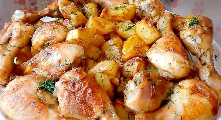 Приготовить ужин можно быстро и не стоять у плиты весь вечер. Нам понадобятся куриные голени, крылья или филе нарезанные на кусочки, что вам больше нравится. Ингредиенты: куриные голени - 700-800 г. сметана + майонез - 3 ст. л. горчица - 1/2 ч.л. чеснок - 3 зубчика масло растительное - 1 ст.л. соль, перец, приправа для курицы - по вкусу картофель - 5-6 шт сыр - 70 г. Смазать противень маслом, выложить курицу посолить, поперчить, смазать сметаной смешанной с майонезом и горчицей. Натереть измельченным чесноком. Оставить минут на 30. Далее почистить картофель, нарезать дольками, посолить. Все посыпать приправой для курицы и натертым сыром. Поставить в духовку, запекать при 180 С примерно 50 минут. Вот и все, ужин готов! Приятного аппетита!