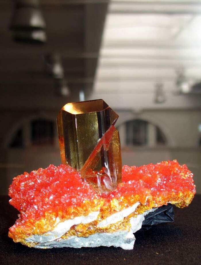 Нашел в папке 2006 г свое старое фото с выставки "Мир Камня", Питер, Центральный выставочный зал "Манеж". Кристалл барита на щётке кристаллов реальгара. Эльбрусское полиметаллическое месторождение, Карачаево-Черкесия.