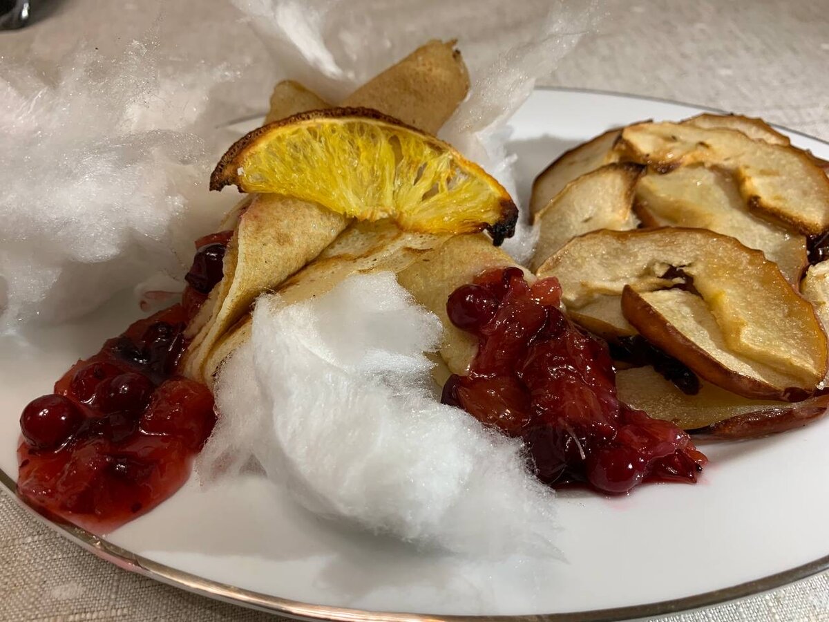 Ох, ну и сложно же заставить детей есть полезные продукты, домашние, без красителей и всяких химозных добавок. В таких случаях родителям на помощь приходит смекалка. Кто то вырезает из овощей разные фигурки животных, строит на тарелке из картошки разные пирамидки или выкладывает из котлет и овощного гарнира затейливые рожицы. Мне вот тоже не единожды приходилось сталкиваться с подобными экспериментами с едой. В связи с этим пришла мысль - а почему бы не сделать тоже самое, но с десертом. Так, чтобы он полюбился не только детям, но взрослым, был красивым, вкусным и главное полезным. И такой рецепт появился в моей кулинарной книге. Он, по сути, состоит из нескольких десертов, которые объединившись, образуют единый кулинарный "ансамбль". Каждый его элемент дополняет друг друга. Вот так выглядят наши готовые блинчики на облачках с яблочной лазаньей. Но обо всем по порядку. Для нашего блюда нам понадобится достаточное количество ингредиентов, это и понятно, десерт не простой. Рецепт самих