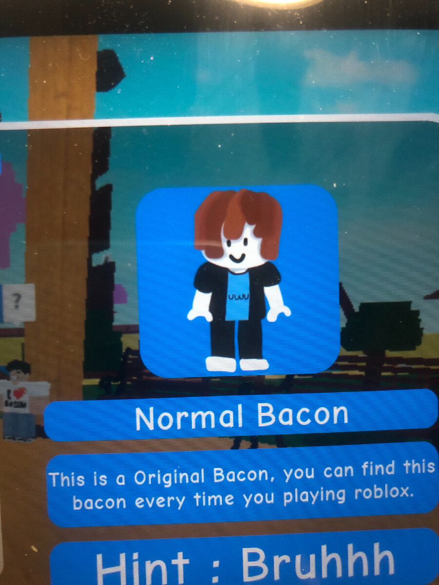 Есть одна популярная игра - роблокс. Про неё я расскажу в отдельной статье. Один из режимов в роблоксе - Find the Bacons (Находить «Беконов») «Беконы» - это вид скинов, которые собраны из начальных бесплатных вещей. В данном режиме надо найти различные виды этих человечков. Я буду рассказывать, как найти некоторые из них: Классический бекон. Его можно получить около спавна, он будет стоять у скамейки «Пандапин» бекон. Его можно получить у спавна, будет стоять у колонны, с ним можно начать вести диалог, но это не обязательно, чтобы забрать его. Листовой бекон. Его можно получить, подойдя к дереву и коснувшись его. Он замаскирован в листве. Дерево с ним находится рядом со спавном: Стесняющийся бекон.(Извините если не правильно перевёл) Его можно найти в земле холма, который находится рядом со спавном, вам надо найти специальное выделяющееся место и зайти в него: На сегодня всё, увидимся в следующий раз, до новых встреч!)
