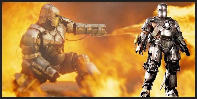 Первая броня, которую создает герой КВМ Тони Старк, – это вопрос жизни и смерти. Вместо того чтобы строить ракету для Десяти колец в пещере посреди пустыни, Тони и его товарищ по плену Хо Инсен тайно собирают броню из тех немногих ресурсов, которые им удалось найти. Они вооружают его двумя огнеметами под каждой рукой, ракетной установкой и очень скромными реактивными ботинками. Вся броня пуленепробиваема, хотя ее поспешная конструкция оставляет под угрозой множество уязвимых мест, таких как суставы и глазные отверстия. Какой бы несовершенной она ни была, главное, что она вдохновила Тони на то, чтобы стать Железным Человеком.