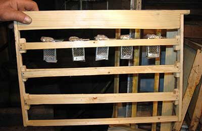 Маточники с брусочков надо срезать осторожно, чтобы не повредить заднюю часть и не уронить. Это надо делать в теплом помещении, не спеша, но быстро. Лишние маточники помещаем в клеточки, обеспечив их кормом в виде канди. Если использовать мед, то матки могут испачкаться и погибнуть. Лишних маток в клеточках желательно поместить в рамку-питомник. Иногда задняя часть маточника торчит из клеточки. Ее можно закрыть мягкой алюминиевой фольгой.