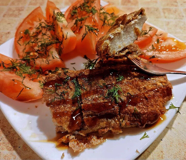 Масса – 390 г, КБЖУ – 307/38/11/14. Сегодня попробовала сделать куриную грудку в кляре из яйца и клетчатки. Получилось вкусно. Грудку куриную делим на три равномерных тонких куска. Ставим сковородку на огонь. Пока сковорода нагревается, в тарелке смешиваем два яйца, соль, любимые специи. У меня чеснок и итальянские травы. В другую тарелку насыпаем клетчатку. Грудку обваливаем сначала в клетчатке, потом в яйце, и снова в клетчатке. Выкладываем на разогретую сковородку. Припекаем с обеих сторон до корочки. Потом в сковородку наливаем 50 мл воды и ложку масла, убавляем огонь и тушим минут 15-20, до выпаривания воды. При необходимости воды можно добавить больше. Я доливала ещё, так как клетчатка, видимо, впитала часть воды. Готовую грудку полила соевым соусом. На тарелку добавила помидорку. Приятного аппетита! Больше общения и рецептов - в группе "Рецепты для диабетиков" в ВКонтакте! Рецепт на странице Автор рецепта - Лиля Телешова