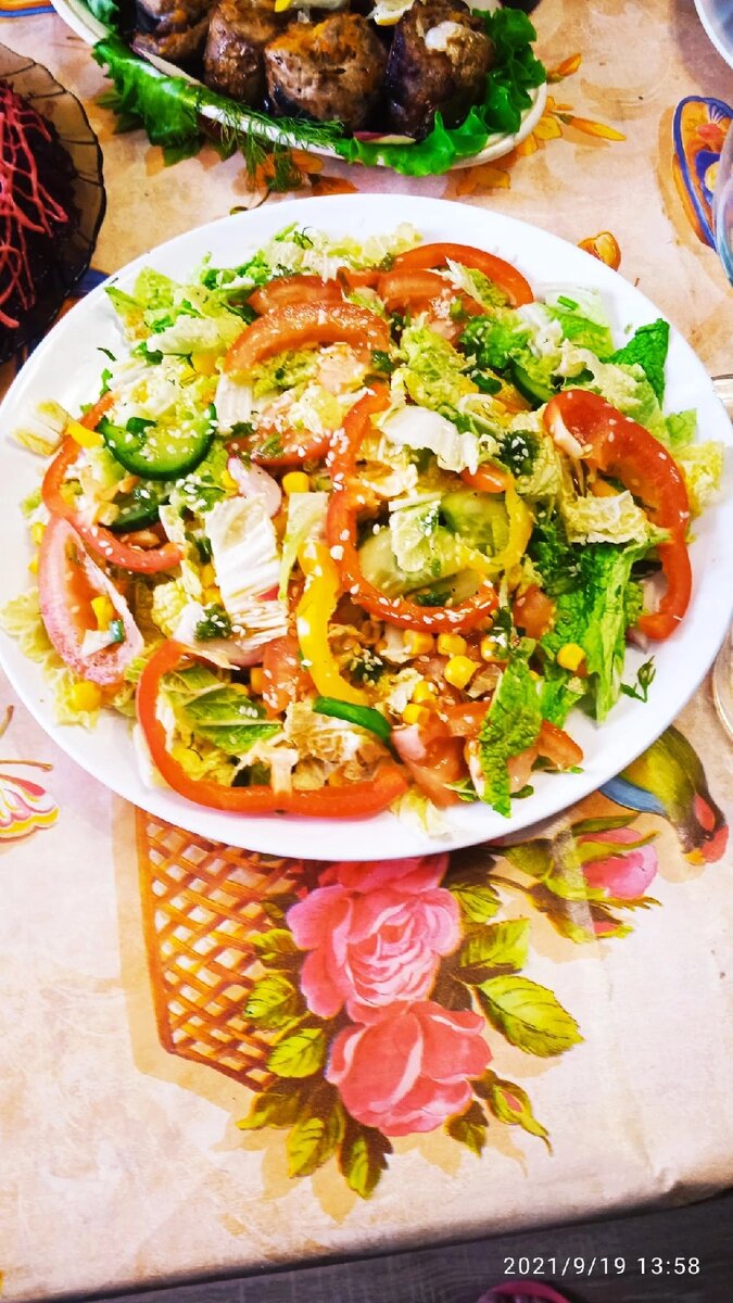 ЭТОТ САЛАТ ПРОСТО ОБОЖАЕТ МОЯ МАМА !!!!! Ингредиенты : Болгарский перец - по 1 шт. ( красный,жёлтый,зелёный ) Салат - 1 пучок Кукуруза - 1 банка Помидор - 2 шт. Пекинская капуста - 1 шт. Кунжут белый и чёрный. Соль,перец свежемолотый. Заправка для салата.( можно использовать покупную ) СПОСОБ ПРИГОТОВЛЕНИЯ : 1) Все овощи крупно порезать. 2) Салат нарвать руками хаотично . 3) Всё смешать, добавить заправку, кунжут, перемешать , Вуаля все готово !!!!! ))))) ПРИЯТНОГО АППЕТИТА!!! ГОТОВЬТЕ ВМЕСТЕ СО МНОЙ И У ВАС ВСЁ ПОЛУЧИТСЯ!!! #еда #рецепт #полезно и вкусно #просто и вкусно #салат #овощи