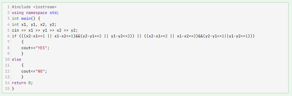 if (((x2-x1==1 || x1-x2==1)&&(y2-y1==2 || y1-y2==2)) || ((x2-x1==2 || x1-x2==2)&&(y2-y1==1||y1-y2==1)))