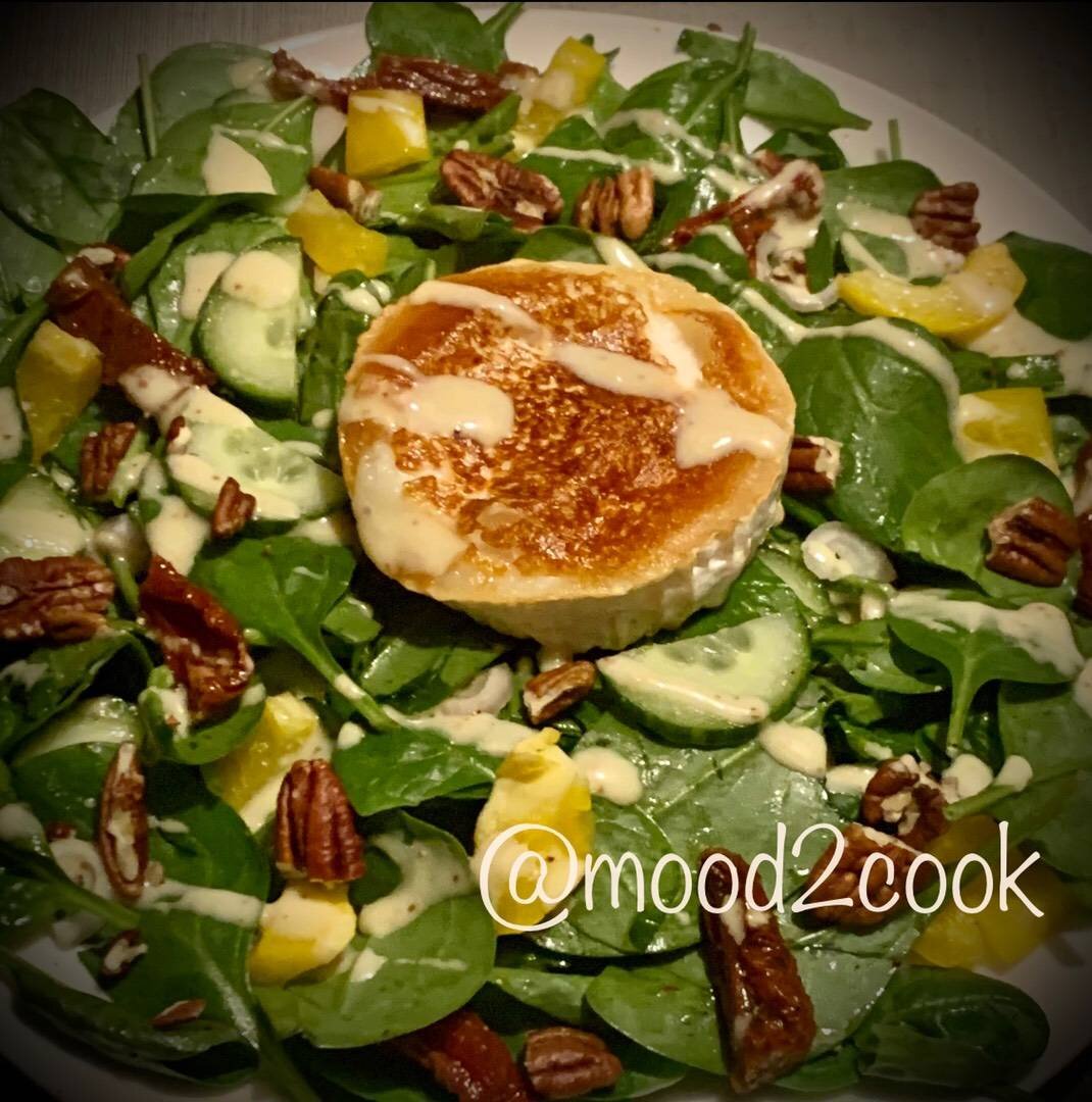 Ингредиенты: Козий сыр , Шпинат бэби, Огурец, Сладкая паприка (желтая или оранжевая), Лук шалот, Вяленые помидоры , Орешки кешью (грецкие или пекан) по вкусу, Медово - горчичная заправка для салата по вкусу, Оливковое масло