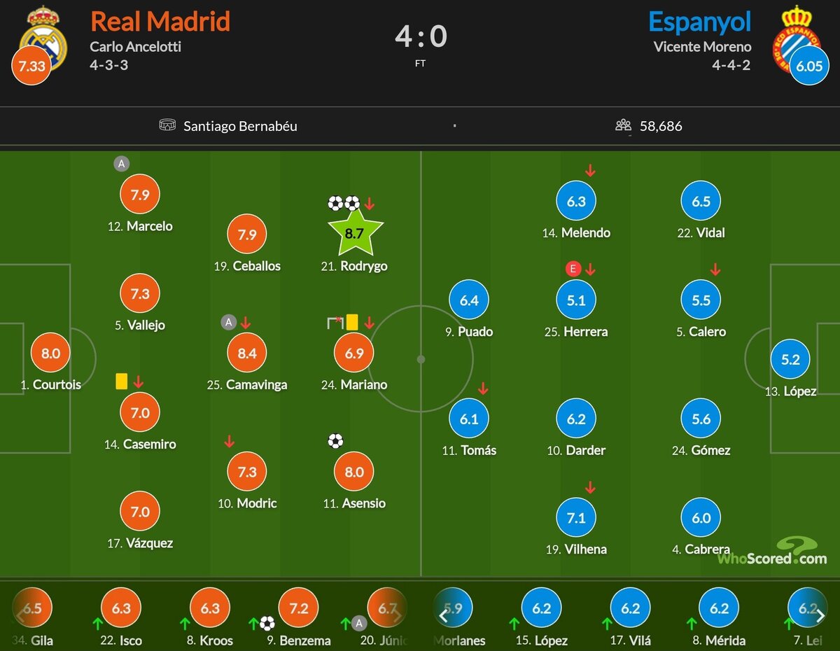 Ла Лига 2021/2022. 34-й тур «Реал Мадрид» - «Эспаньол» 4:0 Оценки игроков от портала Whoscored