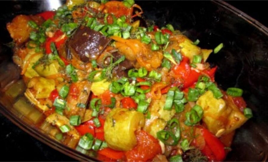 Ингредиенты : Кабачки - 1-2 шт Баклажаны - 1-2 шт Болгарский перец - 3 шт Морковь - 2 шт Лук репчатый - 2-3 шт Помидоры - 3-5 шт Зелень петрушки или кинзы. Растительное масло для жарки. Соль, свежемолотый перец СПОСОБ ПРИГОТОВЛЕНИЯ : 1) Баклажаны разрезать вдоль на 2 половинки, посолить и оставить на 15 минут. Через 15 минут соль смыть, разрезать половинки баклажана еще раз вдоль и крупно порезать поперек. 2) Кабачок разрезать вдоль на 2 половинки, удалить семечки и нарезать крупными кубиками. 3) Морковь вымыть, очистить и нарезать кружками. 4) У перцев срезать верхушку, удалить середину. Перец нарезать крупными кусочками. 5) Помидоры вымыть, разрезать каждый помидор крестиком у основания и опустить на 1-2 минуты в кипяток, затем снять кожицу. Помидоры нарезать дольками или крупными кубиками. 6) Лук нарезать полукольцами. 7) Зелень порубить 8) Овощи сложить в утятницу слоями, каждый слой посолить и поперчить чуть-чуть!!!! Накрыть утятницу крышкой и тушить на слабом огне окол