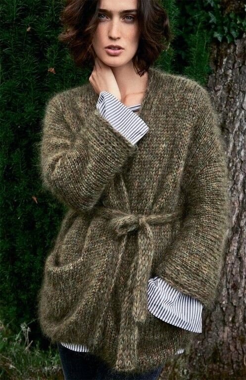 Пряжа (42% мохера, 33% шерсти, 25% полиамида; 137 м/25 г) — 450 (500−550) г цвета хаки/зеленой; спицы № 6 и 7.