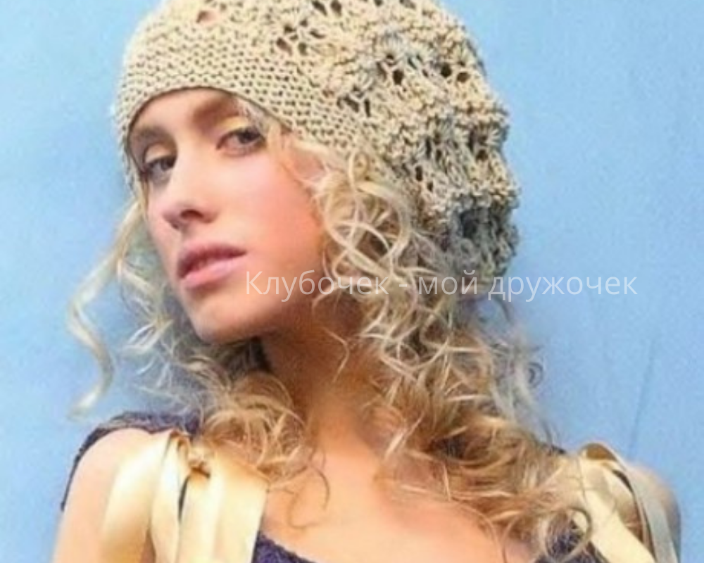 Летний берет, связанный спицами из хлопковой пряжи ажурным узором в романтическом стиле