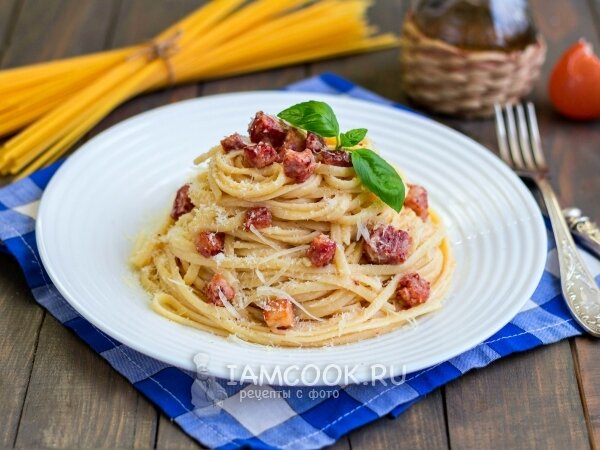 Всем доброго времени суток, сегодня рассмотрим рецепт пасты карбонары - самая популярная итальянская паста в мире. Секрет её популярности не только в доступности ингредиентов и времени приготовления. Главное, это неповторимый вкус - сливочный и нежный, хотя настоящая паста карбонара готовится без сливок. Важно соблюдать рецепт приготовления, чтобы получился правильный соус. Давайте приступим! Нам понадобится(ингридиенты) Всего этого хватит на 5-7 порций. 1)Спагетти - 400 г 2)Бекон - 200 г 3)Яйца куриные - 4 шт 4)Сыр пармезан - 50 г 5)Масло сливочное - 2 ст. ложки,Масло оливковое - 1 ст. ложка 6)Чеснок - 2 зубчика 7)Соль - по вкусу,Перец чёрный молотый - по вкусу Пошагово,что нужно сделать: Первое. Нарезаем бекон кубиками. Два зубчика чеснока раздавливаем ножом.
