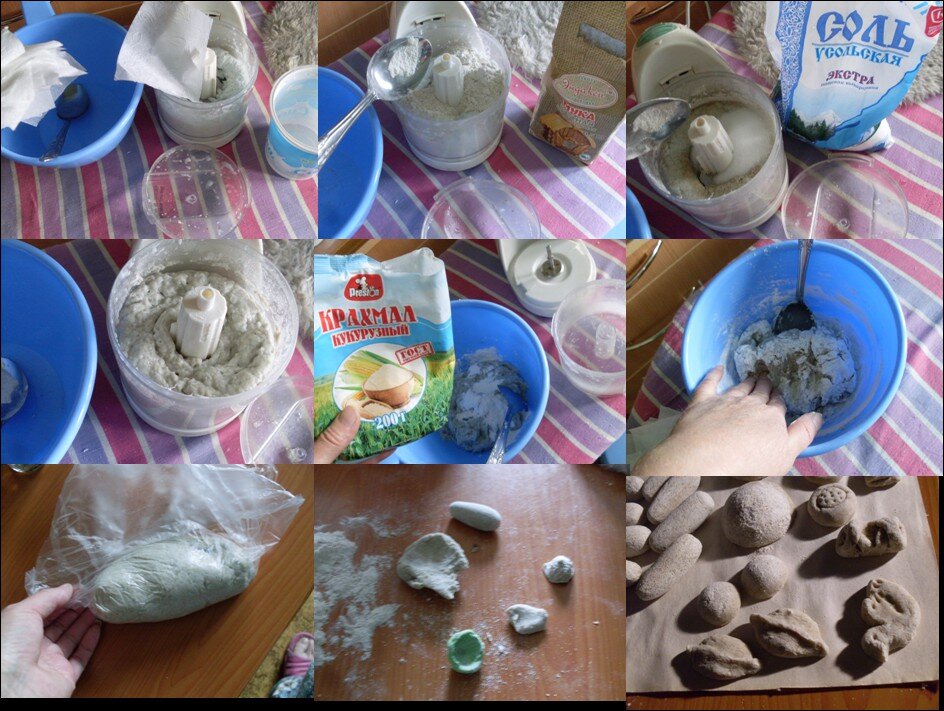 Совет: при лепке из теста, чтобы не липло к рукам и формочкам, можно просто присыпать мукой.