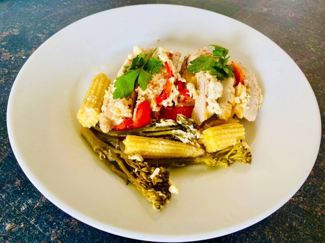 Творожный сыр маленькими кусочками с сывороткой, идеально подходит для этого блюда. При запекании образуется много вкусного бульона и курочка получается очень нежной. #академия #пасха Ингредиенты: куриная грудка (половинки), пластинки сыра, помидоры Черри (или любые), лук Порей, соль, специи для курицы, творожный сыр с сывороткой, смесь любых овощей Способ приготовления: Половинки куриных грудок промыть, просушить. Надрезать вдоль широкой стороны, чтобы получился кармашек. Посолить и приправить, внутри и снаружи. Помидоры нарезать пластинками и кольцами лук Порей. Мне нравятся Черри, потому что другие помидоры у нас, ещё не вкусные. Закладывать в каждый кармашек, слоями: кольца лука + сыр + помидоры + лук + сыр. Закрыть кармашек. Уложить начинённые кармашки в форму, довольно плотно. Они сожмутся, в процессе запекания. Выложить сверху подготовленные овощи, абсолютно любые. Творожные кусочки сыра перемешать с сывороткой и выложить сверху, укрывая овощи и мясо. Закрыть фольгой форму. Разо