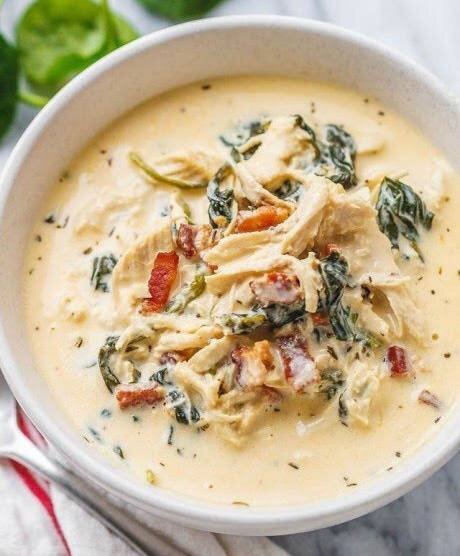Густой куриный суп со сливочным сыром, шпинатом и беконом 📖 Ингредиенты: - Куриные грудки - 900 г. - Сливочный сыр - 340 г. - Измельченный сыр чеддер - 120 г. - Бульон или вода - 550 мл. - Шпинат - 100 г. - Соль, перец - по вкусу - Бекон - 220 г. 🧑🏻🍳 Приготовление: 1. В бульон добавить курицу, сливочный сыр, сыр чеддер, соль и перец. Довести до кипения, варить на сильном огне около 20 минут. 2. Бекон нарезать полосками и обжарить. По прошествии указанного времени вытащить куриные грудки, разобрать их на волокна. Вернуть курицу в кастрюлю, добавить шпинат и бекон. Прогреть ингредиенты в течение нескольких минут до мягкости шпината.