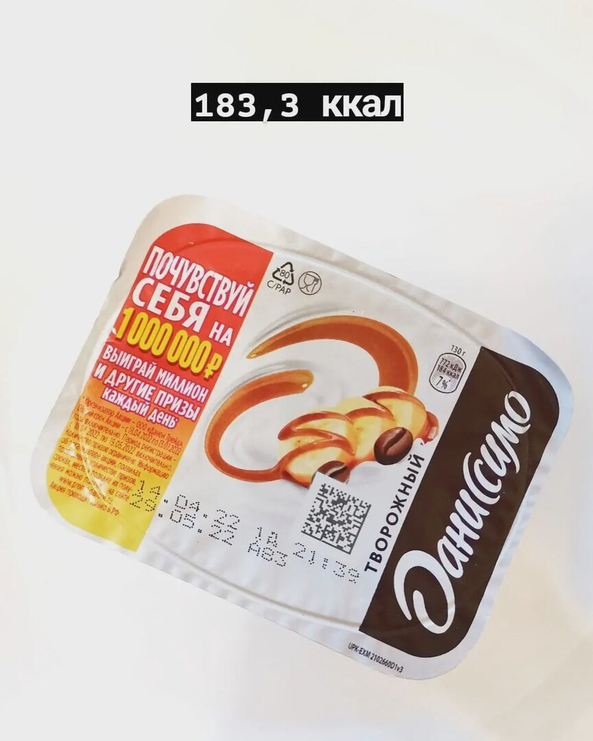 Продукт творожный с наполнением "банан в карамели и кофе" 🤤 Массовая доля жира 5,8% УПАКОВКА: пластиковая баночка, всё такая же по форме как и другие баночеки с творожками других вкусов☺ Светлая баночка с металлизированной пленкой которая разделена на три части: одна коричневая с лого; другая в белом цвете с изображением героев вкуса; А на ещё одной предлагают выйграть миллион 🤪 ВНЕШНИЙ ВИД : Открыв крышечку сразу чувствуется очень насыщенный аромат кофе🤤 Сам творожок обладает нежно- коричневатым оттенком. Он однородный, нет в нём никаких вкраплений, никаких фруктовых кусочков. Так что, банан тут только в виде пюре, перемешанного с творожной массой. По густоте средне, и текстура очень нежная😏 ВКУС: во вкусе творожка ощущается карамель, и ещё более отчётливо ощущается именно банан🍌 Вкус бананового пюре прям на передний план выходит, а потом уже и карамельная сладость ощущается и кофейное послевкусие😏 Вообще вкусное сочетание и не приторно сладко получилось 👌 Очень кофейный аром