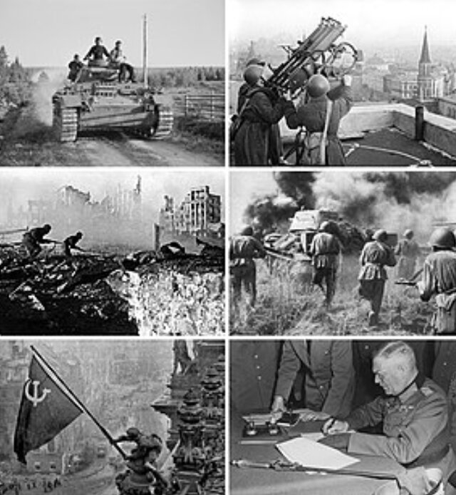 Вели́кая Отечественная война́ (22 июня 1941 — 9 мая[5] 1945) — война Союза Советских Социалистических Республик против нацистской Германии и её европейских союзников (Венгрии, Италии, Румынии, Словакии, Финляндии, Хорватии), начавшаяся с вторжения их войск на советскую территорию и закончившаяся освобождением от фашизма стран Центральной и Восточной Европы; важнейшая составная часть Второй мировой войны, завершившаяся победой Красной армии и безоговорочной капитуляцией вооружённых сил Германии. В западных странах именуется «Восточным фронтом»[6], в Германии — также «Немецко-Советской войной[7]».