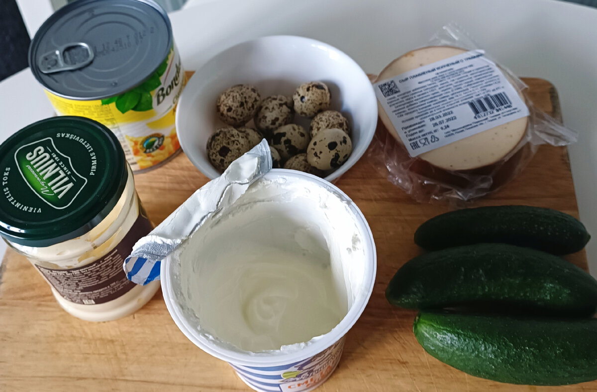 Всем доброго времени суток! Сегодня готовим быстрый и вкусный салат. Нам понадобится: Сыр, огурцы и яйца трём на крупной тёрке. Добавляем кукурузу. Заправляем сметаной и майонезом. Всё просто . Приятного аппетита!