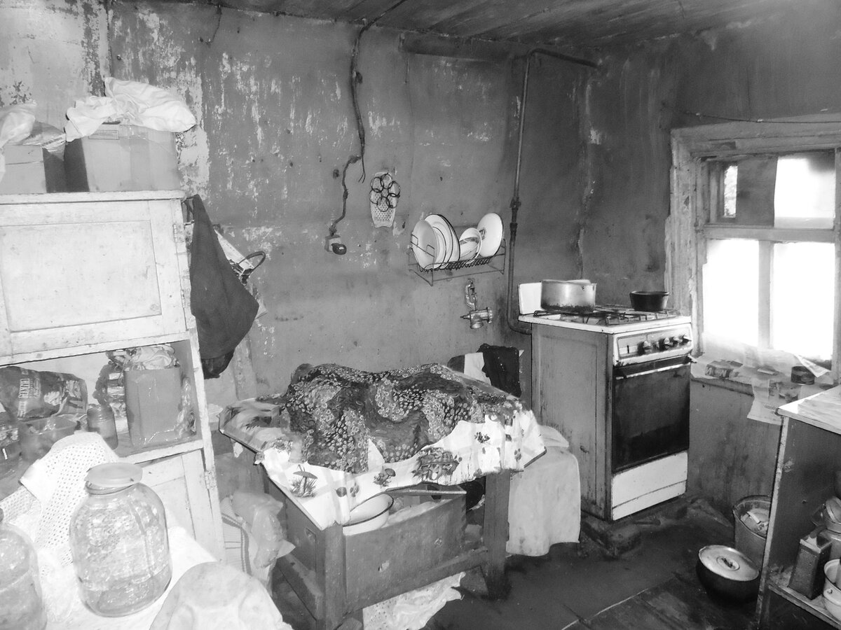 В доме было душно, пахло перегаром и чем-то пригоревшим. Над кроватью, на стене в большой рамке, выкрашенной голубой масляной краской, были размещены выцветшие чёрно-белые фотографии. В центре рамки была фотография молодых мужчины и женщины, держащих на руках двух маленьких девочек.