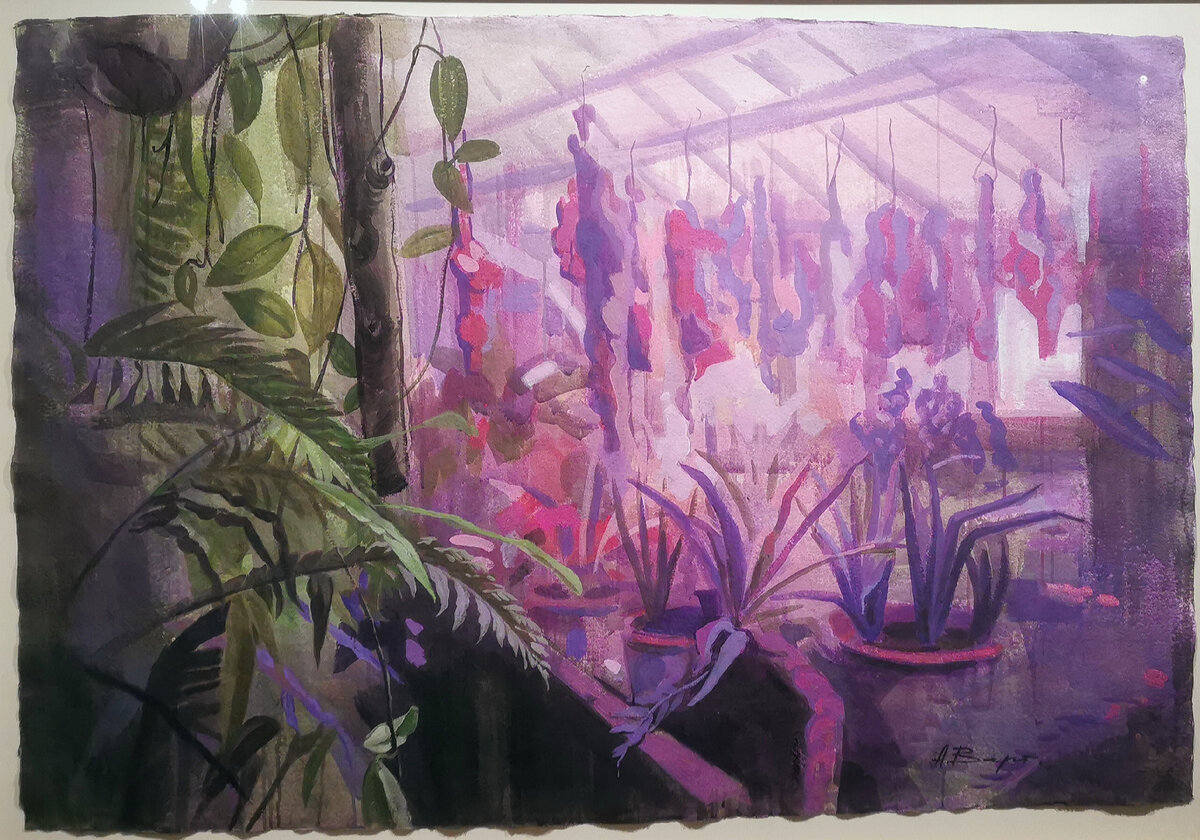 В галерее «Триумф» проходит выставка Александры Вертинской - супруги владельца галереи (племянницы всеми любимой актрисы Анастасии Вертинской). ⠀ Хотелось бы отметить красивое сочетание зеленых и фиолетовых тонов на картинах, однако, цвета примерно одинаковые и не происходит развития отношений оттенков фиолетового и зеленого. Было бы интересно увидеть изменение оттенков зеленого и подбор иного оттенка и тона фиолетового, игру с насыщенностью. В целом в каждой картине есть модуляции этих цветов, но в пределах яркости и насыщенности. В результате картины хорошо сочетаются между собой, так как в целом они одинаковы по цветам и контрастам, как будто на них наложен общий фильтр. Это создает единую атмосферу выставки, но выигрывает ли от этого искусство? Хотелось бы проследить некоторое развитие цвета, но, видимо, художницы ставила другие задачи. Вопрос – какие? Автор «гениальной» экспликации к выставке восхищается особой лёгкостью кисти, но у автора текстов «Триумфа» всегда была с